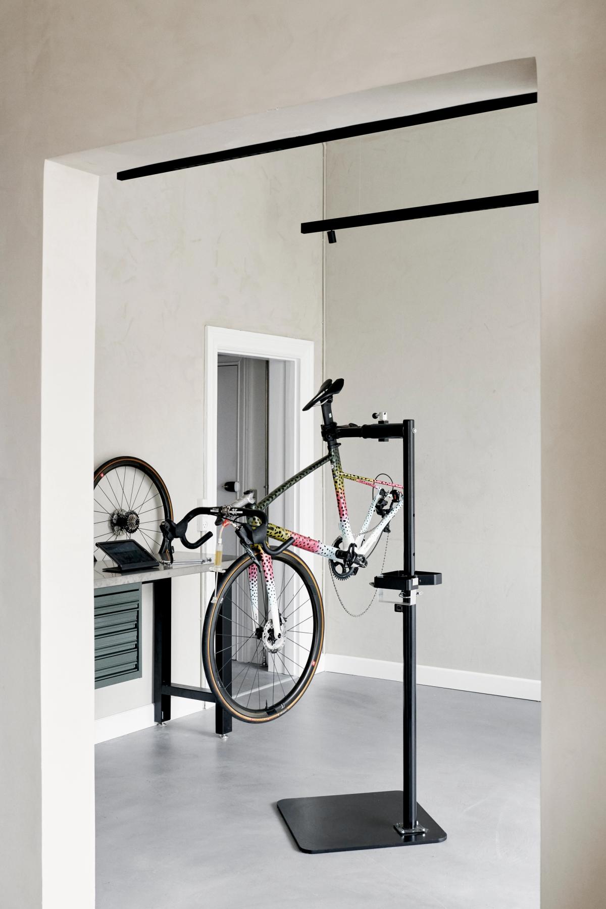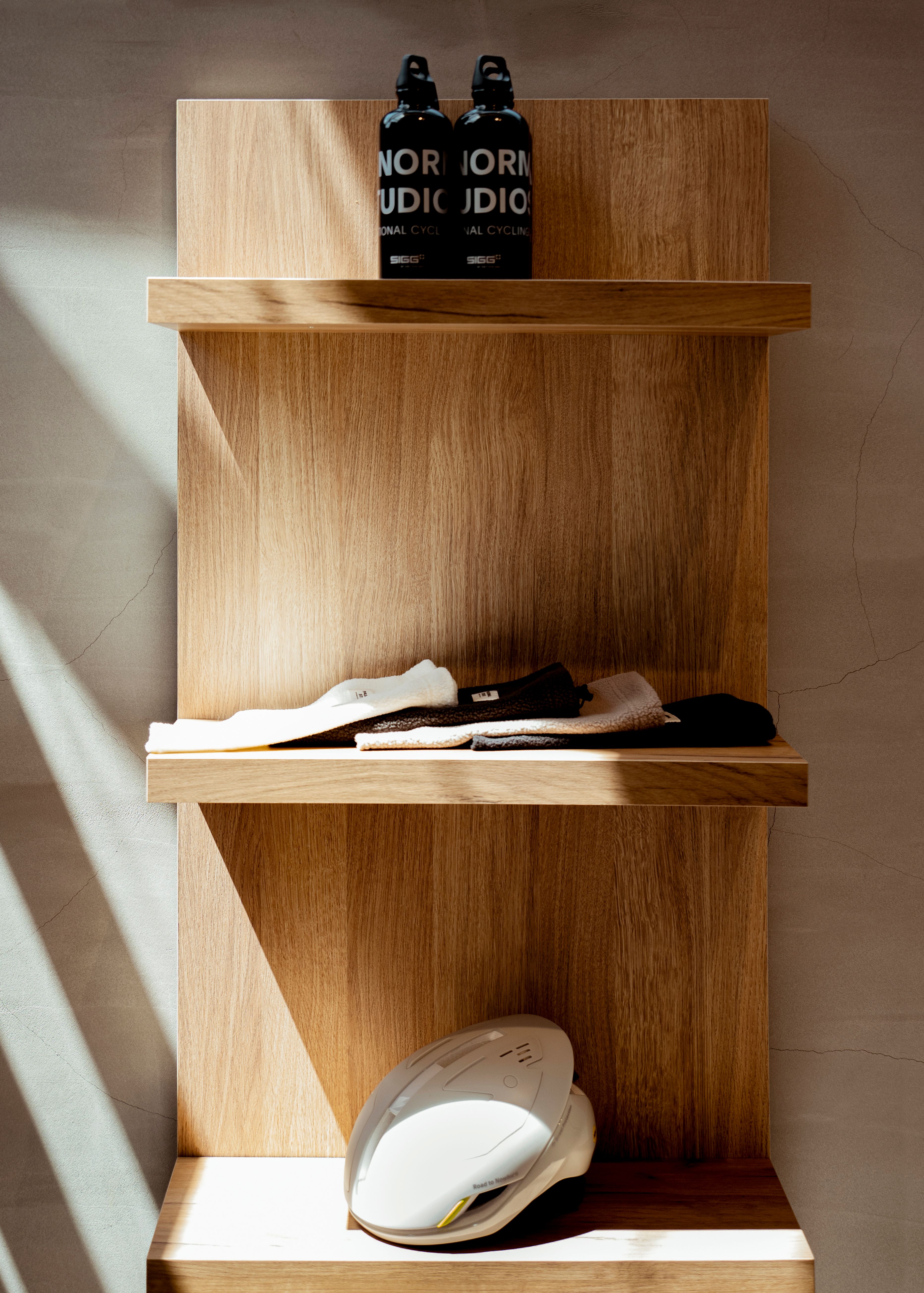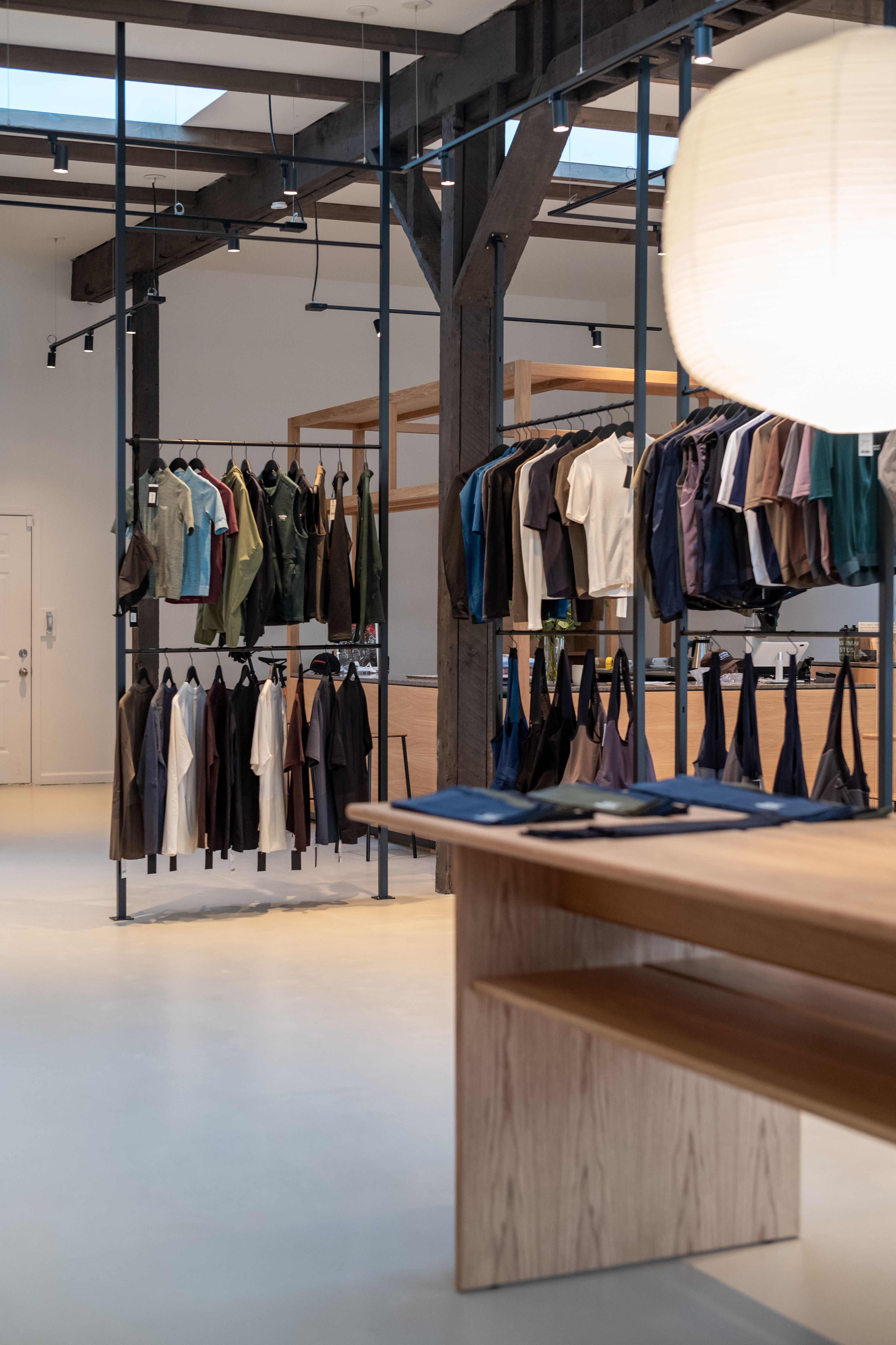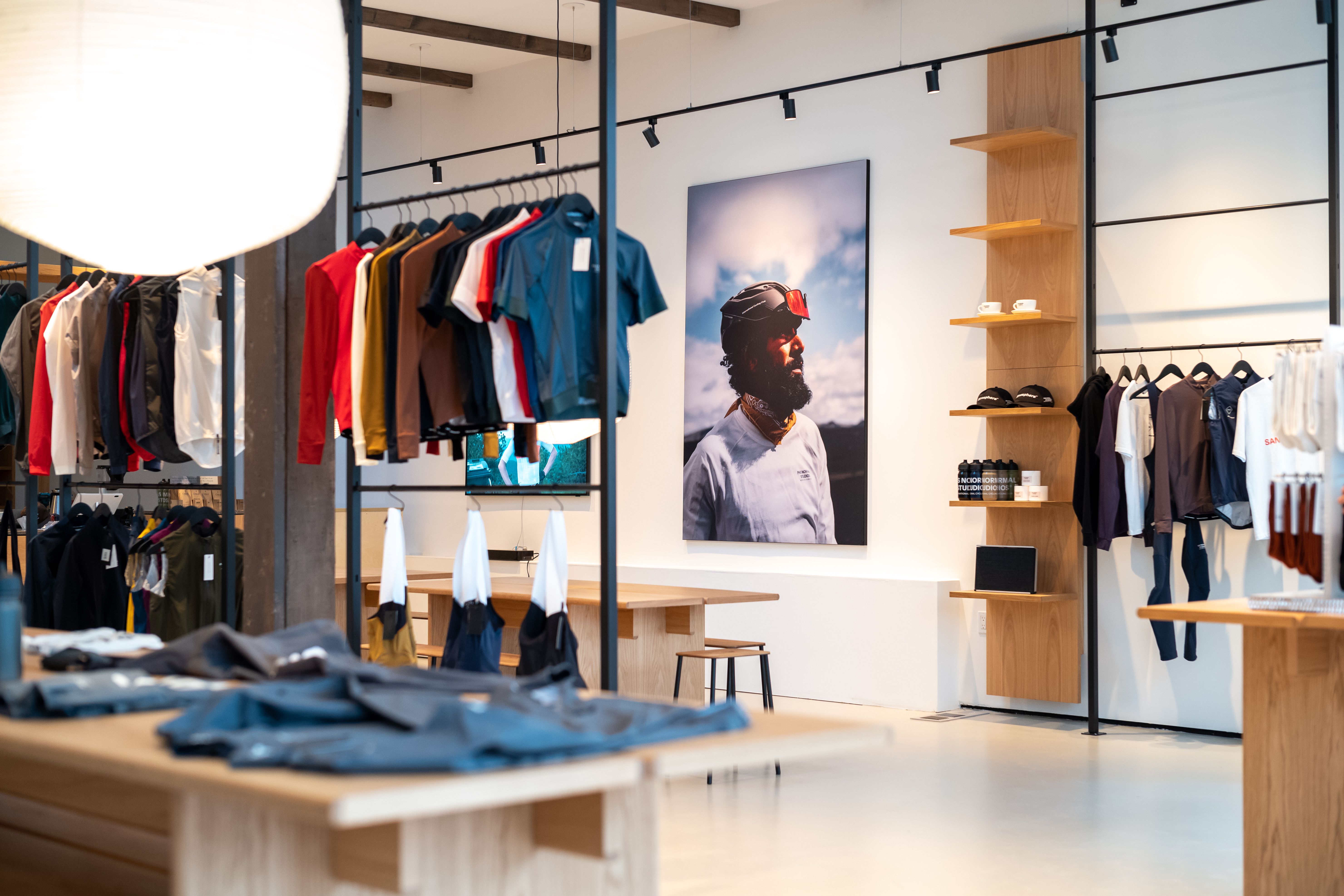 The design concept reflects a vision to embrace the local cycling community and offer technically advanced apparel in a welcoming and domestic-like space where customers not only purchase cycling gear but are just as likely to stop by for a coffee in a relaxed and welcoming atmosphere. The simple, yet innovative interiors of the retail space focuses on natural materials and finishes, offering a warm and tactile palette in subtle contrast to the tech garments and accessories displayed, making them stand out in the space.