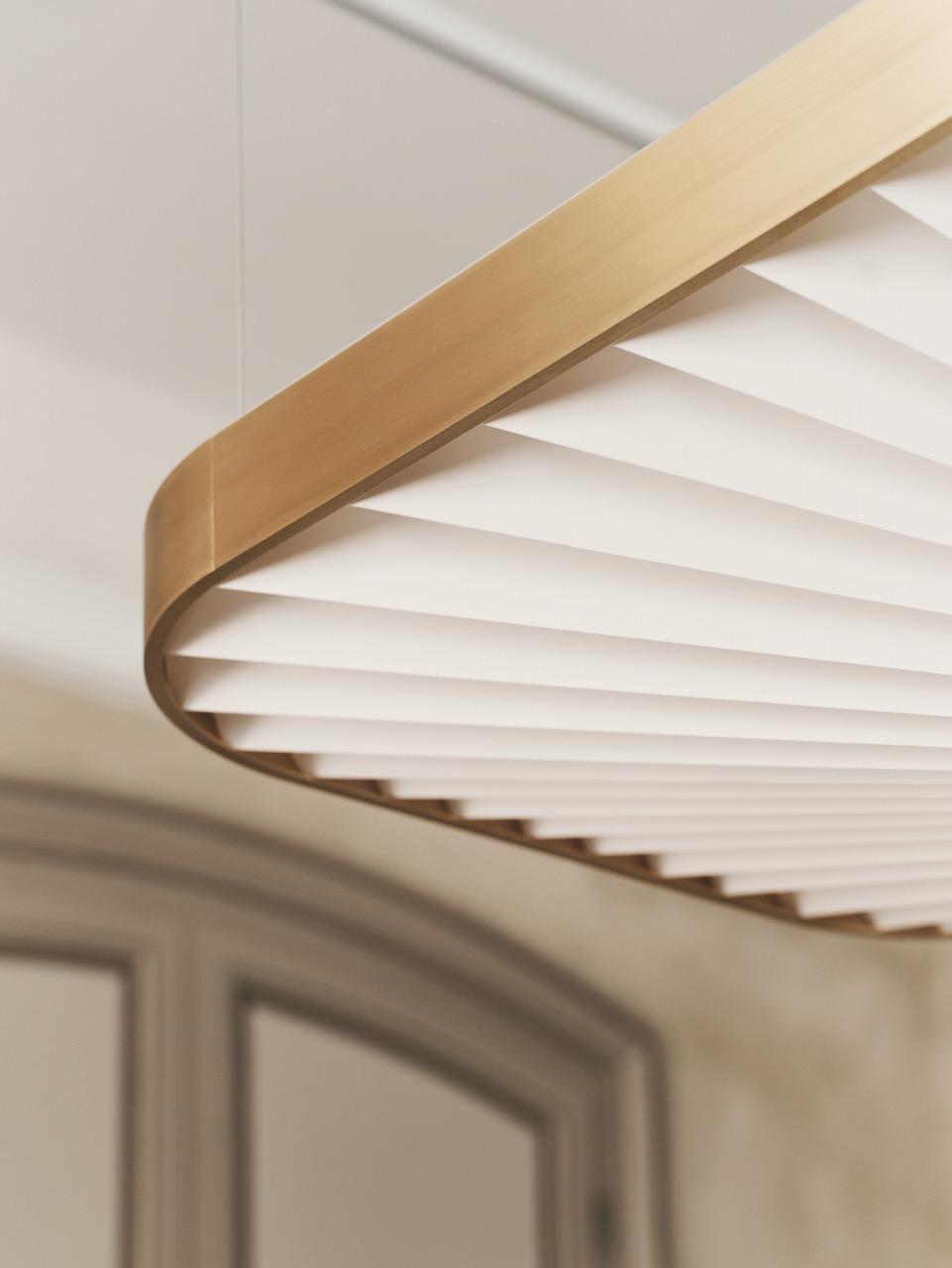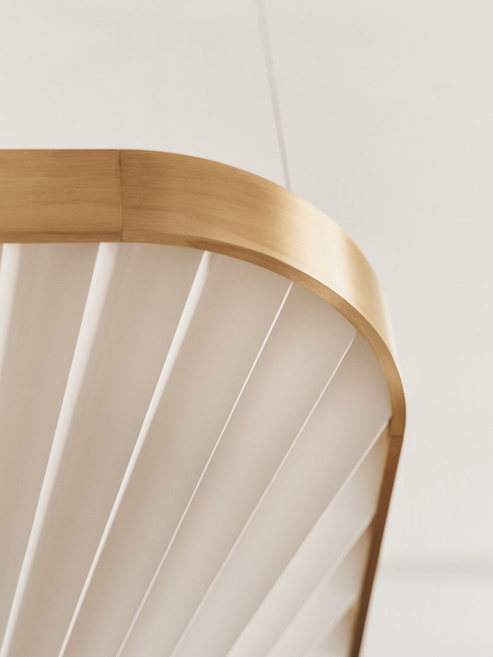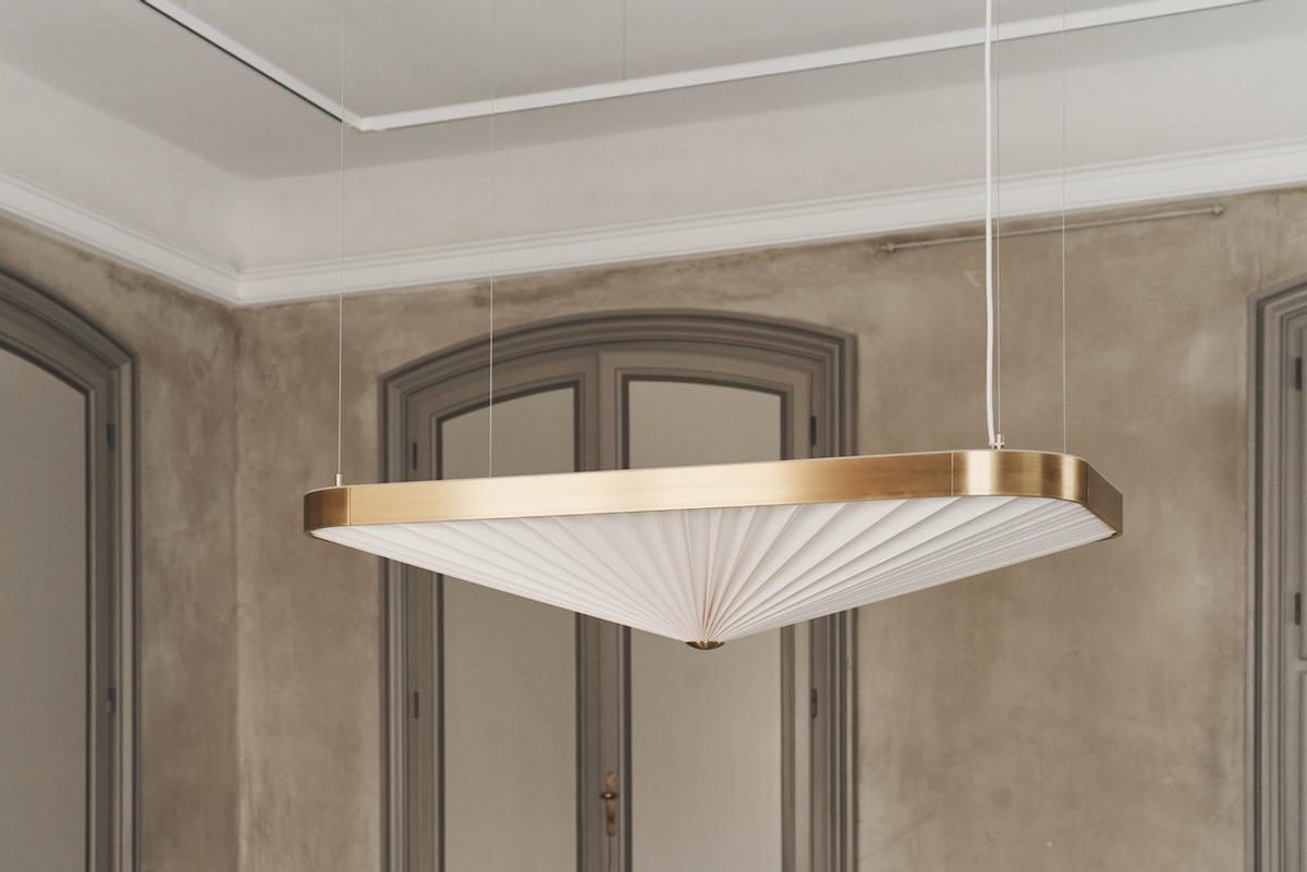 It was Designmuseum Danmark’s original architecture with clean lines, daring curves and geometry, which inspired OEO Studio, when they started the process of designing a new lamp for the museum. At first glance, the Celine lamp has a very simple and clean look, but the lamp’s design is very complicated and consists of an outer shape made from solid brass and a folded interior shade, which follows the outer shape.