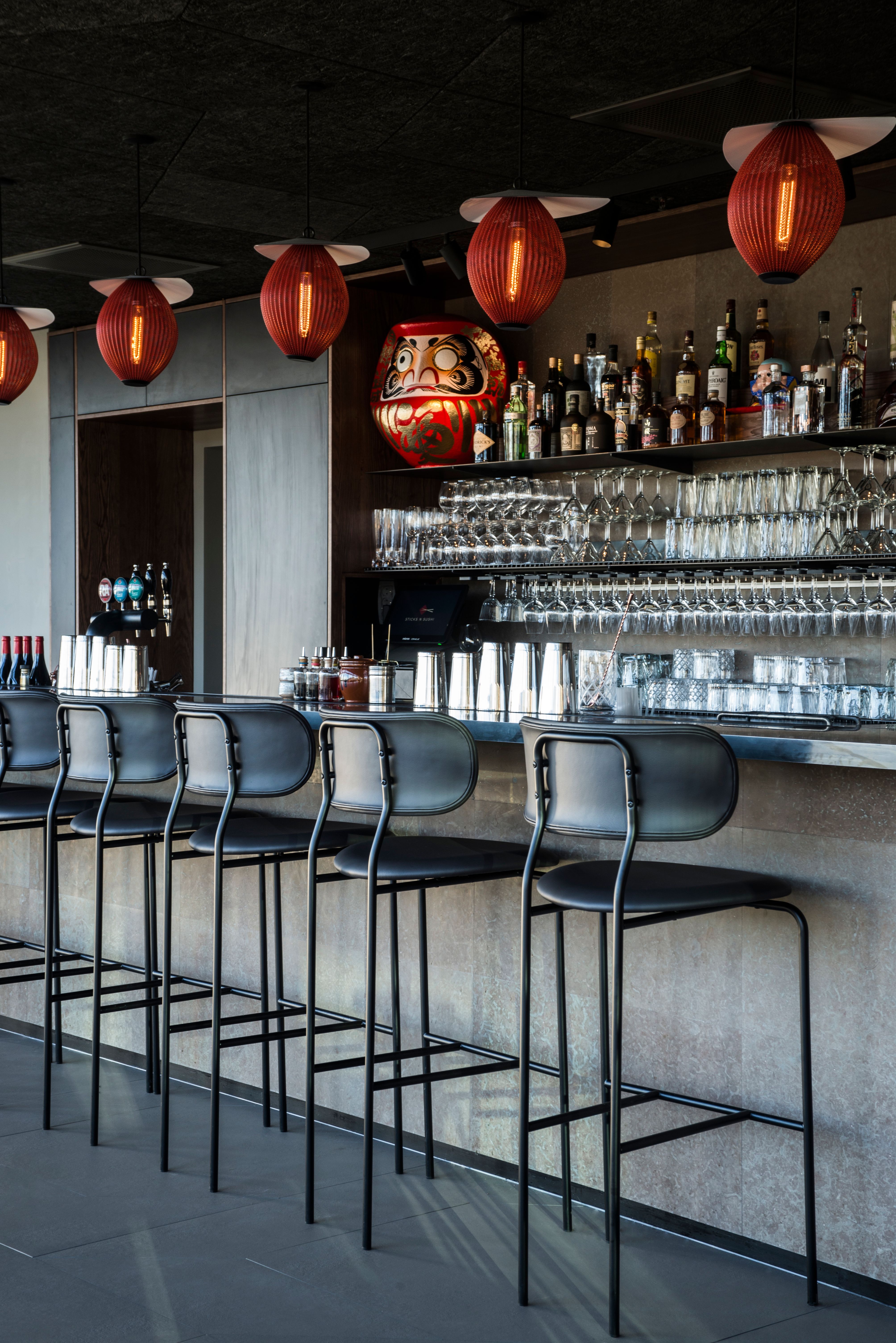 The interior design concept devised for the restaurant by OEO Studio is based on the Sticks’n’Sushi brand universe, which reflects a meeting between west and east and draws inspiration from Japan reinterpreted in a modern, European context. The result is a unique spatial experience with many evocative details, bespoke solutions and high-quality materials. A warm, welcoming and comfortable atmosphere with small, whimsical surprises that offer a taste of Japan.